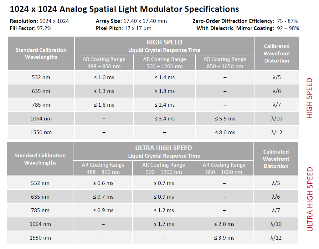 Der Spatial Light Modulator High Speed arbeitet zuverlässig über einen breiten Wellenlängenbereich von 488 bis 1650 nm. Außerdem kann er flexibel an spezifische Anwendungen angepasst werden. Seine Dielektrische Spiegelbeschichtung sorgt für eine Reflexionsfähigkeit von bis zu 98 %, was eine maximale Effizienz gewährleistet. Zusätzlich reduziert der SLM die Diffusion im Nullten-Ordnungseffekt auf ein Minimum. Deshalb bietet er optimale Leistung, selbst bei leistungsstarken Lasern.